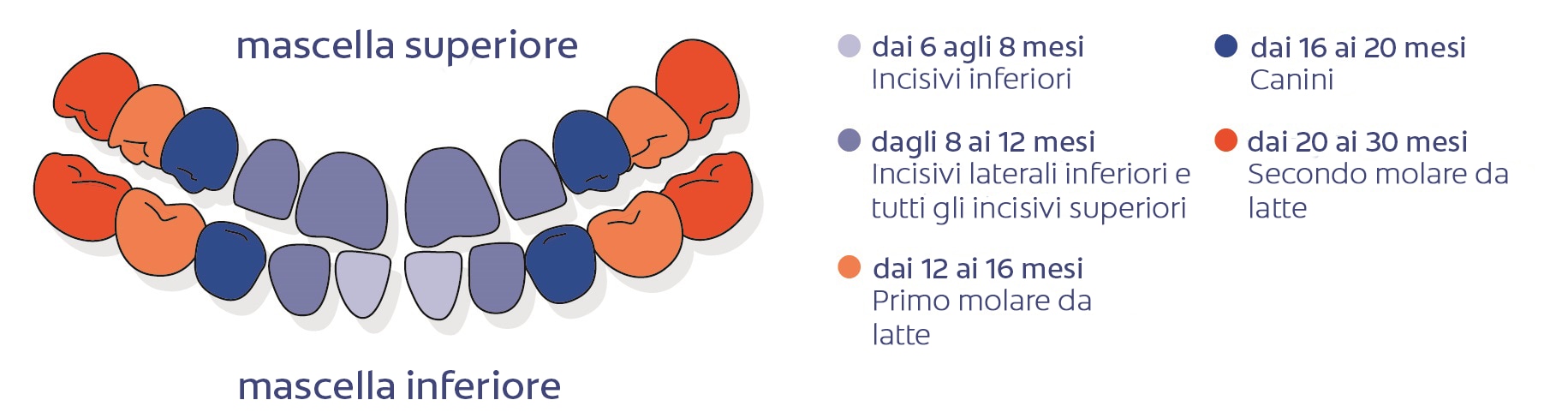 Una aspetto importante nella salute dentale dei bambini è la sostituzione di tutti i denti da decidui a denti permanenti. Gli incisivi centrali inferiori sono solitamente i primi denti da latte a fuoriuscire. Fuoriescono intorno al 6 ° -8 ° mese di vita del bambino, seguiti dagli incisivi superiori e laterali nell'8 ° e 12 ° mese. Seguono i molari anteriori superiori e inferiori prima che i canini decidui si sviluppino intorno al 16 ° mese. I molari posteriori da latte compaioni tra il 20 ° e il 30 ° mese e rappresentano il termine della dentizione decidua.