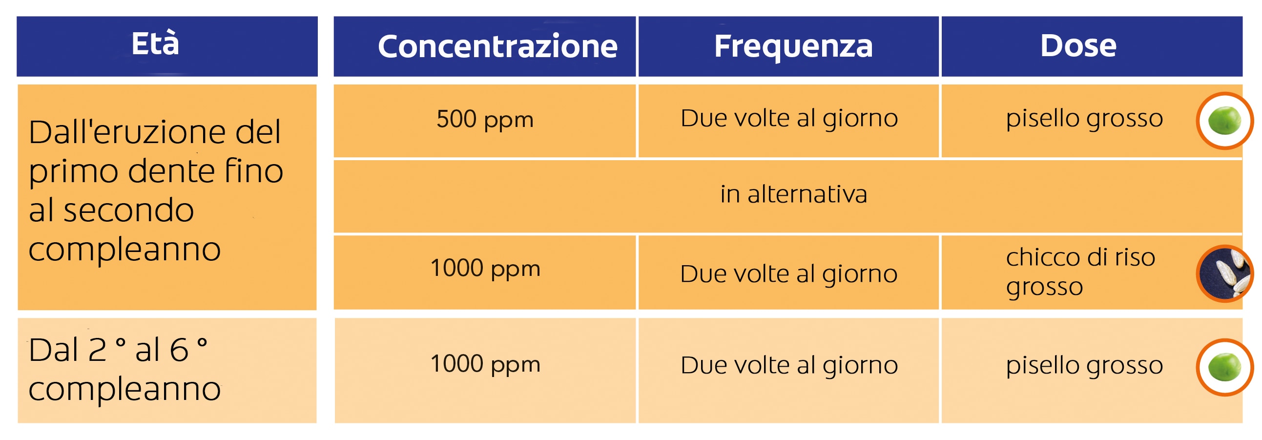 In alternativa, fino all'età di 2 anni, può essere utilizzata una quantità di dentifricio in pasta con 500 ppm di fluoro due volte al giorno. La tabella seguente fornisce una panoramica delle nuove raccomandazioni.